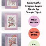 3 Cards using the Fragrant Layers Bundle features three handmade floral cards in Fresh Freesia, Calypso Coral, and Soft Sea Foam, progressing from a simple stamped design to a layered die-cut floral frame with sparkle and texture.