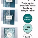 The Snowflake Kisses Bundle by Stampin’ Up!® was the perfect choice for this week’s project because snowflakes are timeless, elegant, and oh-so versatile. I love how they can be as simple as a crisp stamped image or as dramatic as a layered die-cut with shimmer and shine. The color palette I used — Pretty Peacock, Pool Party, and Basic White — captures the cool, cozy feel of winter without feeling heavy. It’s light, refreshing, and perfect for cards that will make your friends and family smile when they open the mailbox.