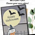 I started with a Basic Black card base and added a piece of Beautiful Gallery Designer Series Paper for the night sky. The Lemon Lolly moon makes the sentiment pop and gives those die-cut bats the perfect place to perch. The lower panel is a smooth blend of Gray Granite and Basic Gray, giving just enough depth to the spooky-fun fence scene without feeling heavy. The real star? That darling little cat in costume—colored in with Stampin’ Blends and ready to cast a spell (or steal a candy or two).