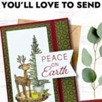 At the heart of this card is the Rustic Centerpiece Stamp Set, which I’ve loved using for both everyday cards and now, holiday designs. This particular card combines several elements from that set to create a charming woodland scene: a carved wooden reindeer, an evergreen tree in a pot, a soft glowing candle, and a few holly sprigs for that extra festive touch. The whole arrangement sits atop a stamped tree-slice base, creating a cozy focal point that feels both homey and elegant.