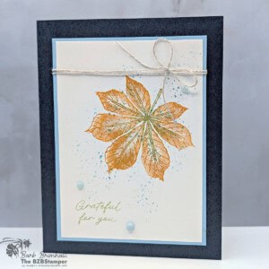 Using the Balmy Blue ink pad, stamp the speckles randomly around the leaf as desired.